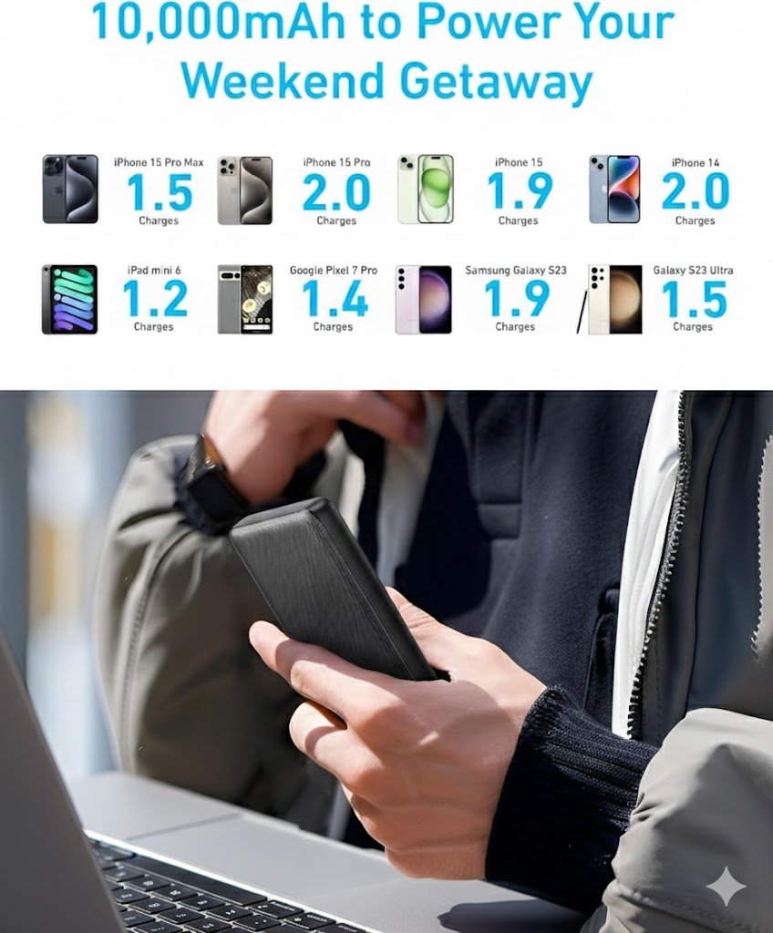 Slim Size, Big Power: Delivers up to two full phone charges in a lightweight design. Compact and Lightweight: Measures 5.99 × 2.81 × 0.61 inches and weighs only 8.6 oz. Durable Design: Scratch-resistant build with certified 3.2 ft drop protection. Two-Way USB-C Charging: Supports fast input and output for convenient recharging. Complete Package: Includes power bank, USB-C cable, user guide, and warranty.