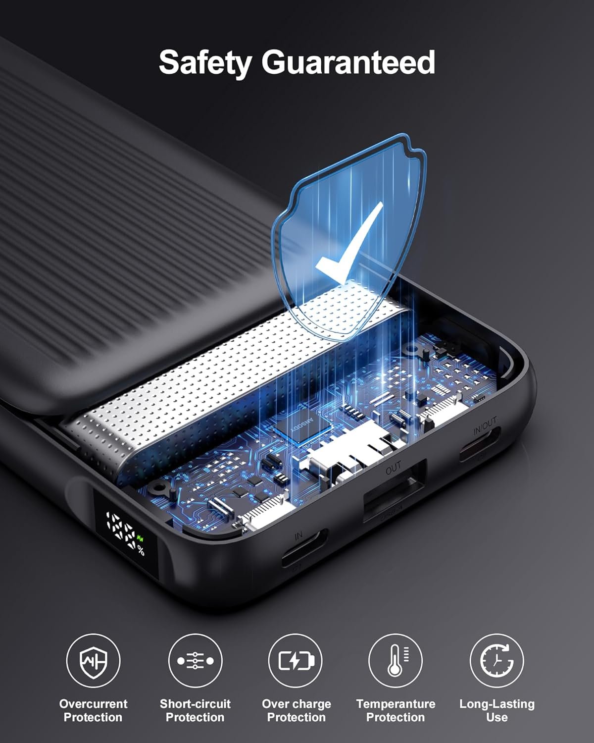 2-in-1 Value Pack: Two 10,000mAh chargers with 22.5W fast charging for sharing or travel. High-Speed 22.5W Charging & Triple Ports: 1 USB-A + 2 USB-C ports charge multiple devices simultaneously. Slim Travel Essential: Ultra-thin 13.9 × 6.9 × 1.6 cm, lightweight 225g design fits pockets and bags. Reliable Power & LED Display: Powers multiple phone charges with precise LED percentage indicator. Smart Safety & Complete Package: Built-in protection against overvoltage, overcharge, overcurrent, includes 2 power banks, USB-C cables, and manual.