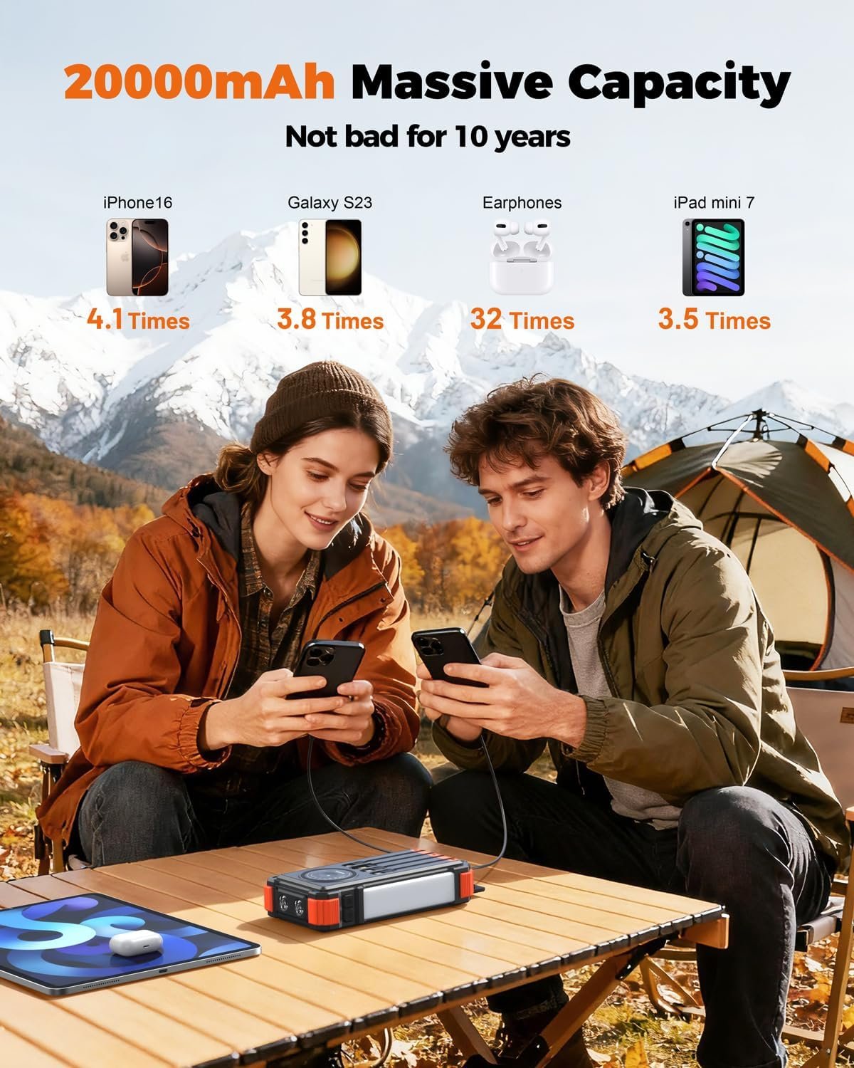 Upgraded Hand Crank Power Bank: Generate instant power anytime with a built-in hand crank for emergencies, camping, and outdoor adventures. 15W Wireless Fast Charging: Supports 5W/7.5W/10W/15W wireless charging for iPhone, Samsung, and other compatible devices. Charge 7 Devices Simultaneously: Four built-in cables and three ports allow multi-device charging without extra cords. Multifunctional Outdoor Design: Includes flashlight, lantern, compass, thermometer, carabiner, and durable waterproof, shockproof, dustproof casing. Massive Capacity & 20W Fast Charging: 20000mAh battery powers phones, tablets, and devices quickly for travel, emergencies, and daily use.