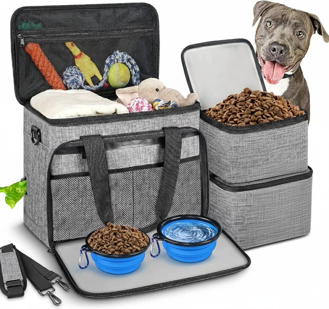 Comprehensive All-In-One Travel Kit: Features a complete 6-piece coordination system including two large food containers, two collapsible bowls, and a dedicated treat pouch, making it the perfect gift for organized road trips and camping.