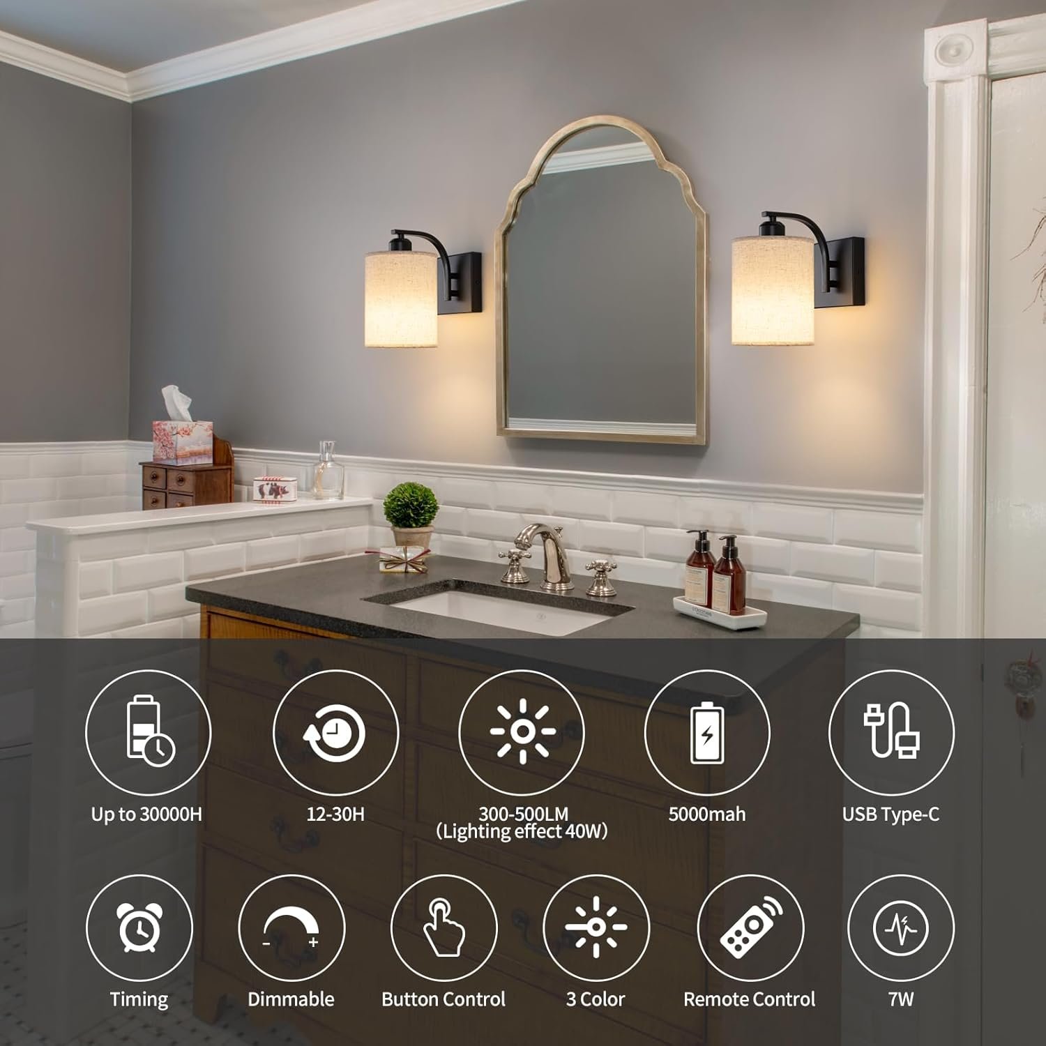 • 【Rechargeable and Timing】: Enjoy wireless lighting with our matte black wall lamps. Each set includes two sconces with USB chargeable bulbs that provide 300-500 LM of bright light. With a 5000mAh battery, these sconces can light up your space for 12-30 hours on a full charge. The magnetic base bulb allows for easy charging, and the 4 timing options (15min, 30min, 1h, 2h) give you control over when the lights turn on and off.
