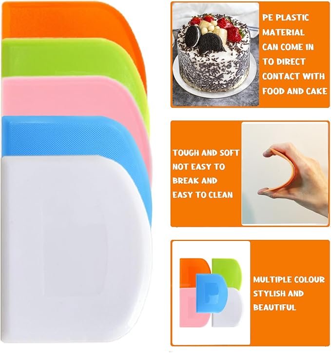 • 【Easy to Clean】These dough scrapers are made of food-grade PE plastic, which is tougher and not easy to break compared to cheap PP materials, and can be washed in warm water or dishwasher after use.