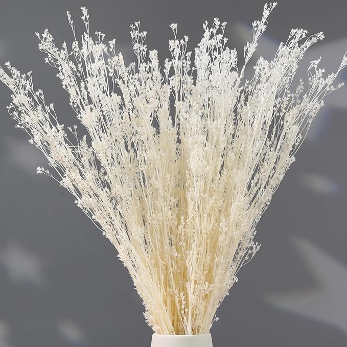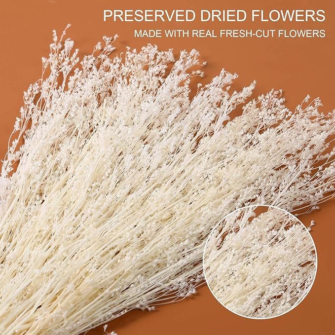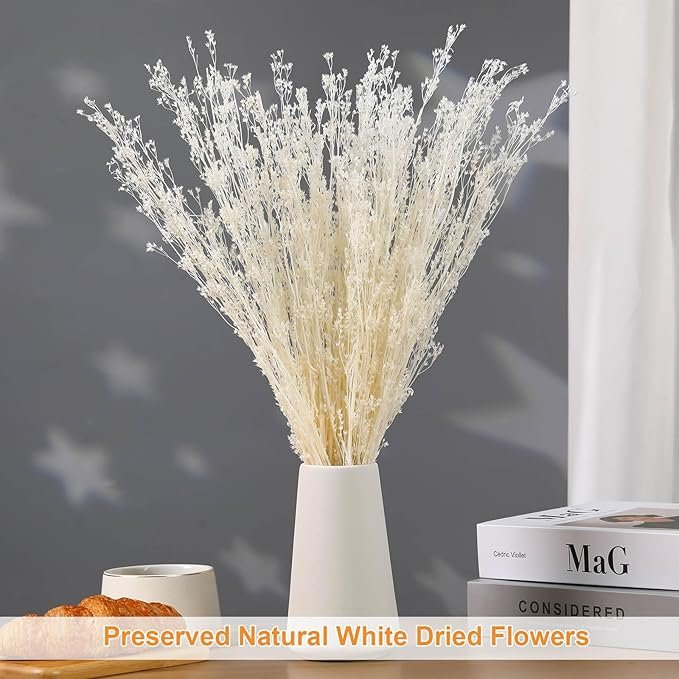 • Indoor and Outdoor Decor: The dried flower arrangement can bring warmth and style to any space. As boho decorations, it is perfect decor for home, party, wedding, gift box, farmhouse, exhibition, living room, banquet decorations and photography props. White baby Breath flowers can be used for hand-made such as dry bouquet matching, DIY glue, hand account, wreath, branches for vase